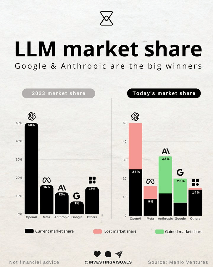 But then, towards the end of the year, Google launched Gemini 3, and since then, it’s been considered to be the best AI Model. ChatGPT, which was the dominant LLM since it was release on 30th November 2022, saw its market share halved by end of October 2025.